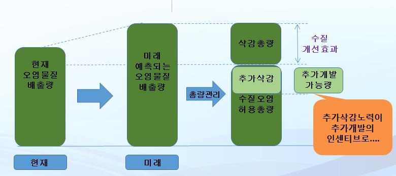 - 지자체에서 배출량을 줄인 양만큼 해당지역의 개발용량이 증가하므로 수질보전을 위한 노력이 해당 지자체의 개발에 대한 혜택으로 전환됨
